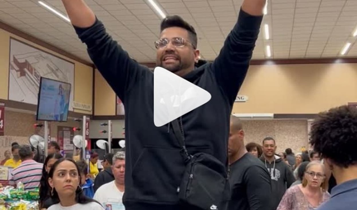 Enquanto aguardava na fila do caixa, Renner subiu dentro de um carrinho de compras e anunciou aos clientes e funcionários que era o aniversário da companheira, a empresária Gessika Borges. Em seguida, ele pediu que todos cantassem “Parabéns pra você”, animando o local e arrancando risadas.