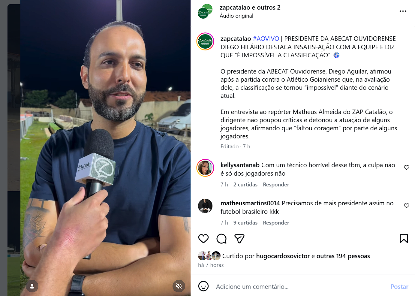 Após a derrota por 3 a 0 para o Atlético Goianiense no primeiro jogo das quartas de final do Campeonato Goiano 2026, o presidente da Abecat, Diego Hilário, concedeu entrevista ao portal ZAP Catalão Notícias e adotou um discurso firme ao comentar o resultado negativo.